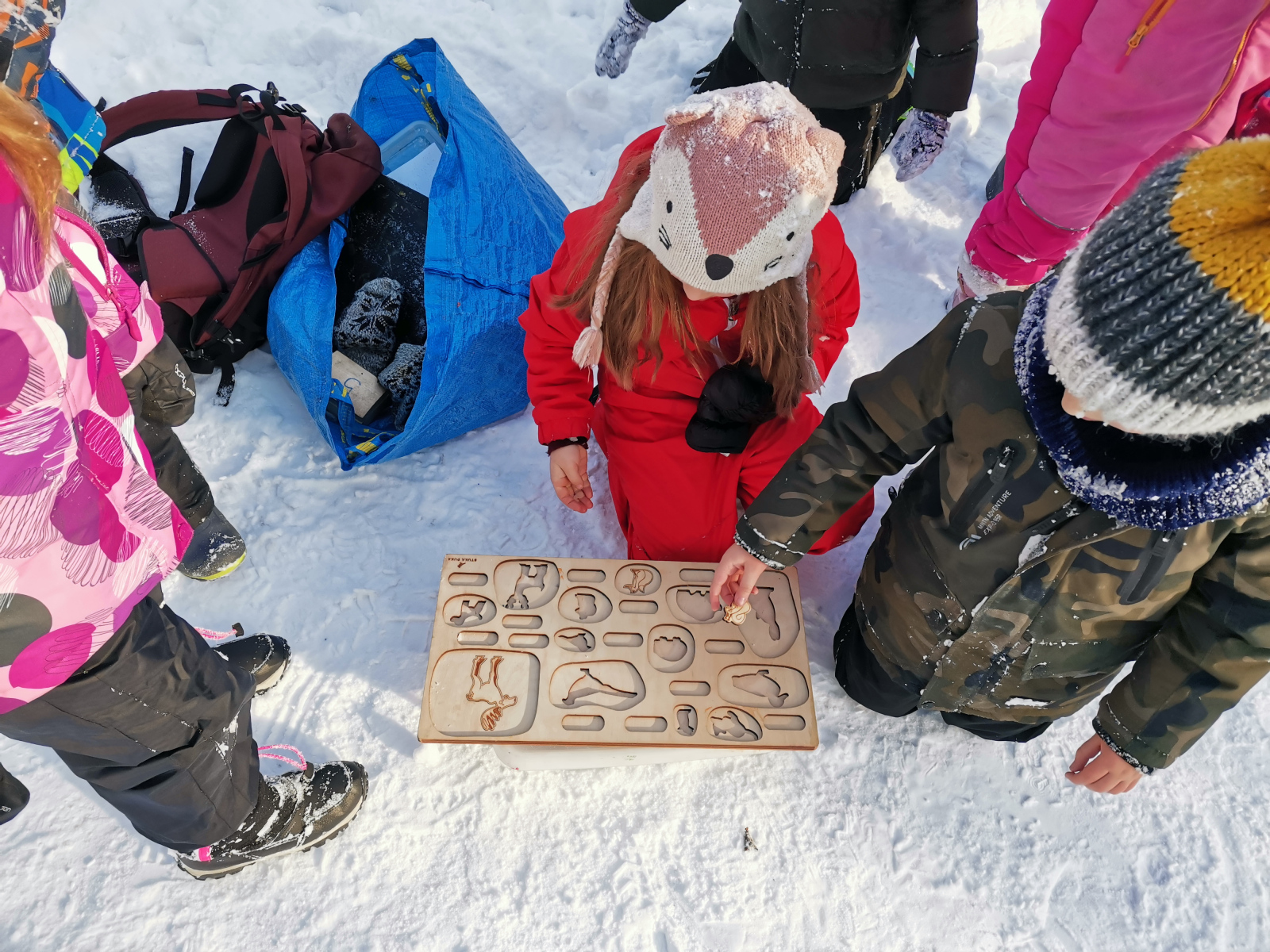 Na razie Dzikie Wędrowanie odbyło się dwa razy. Oba wyjścia były świetne. Śnieg, tropy, szyszki, lornetki, ptaki, budowanie łódek z kory…