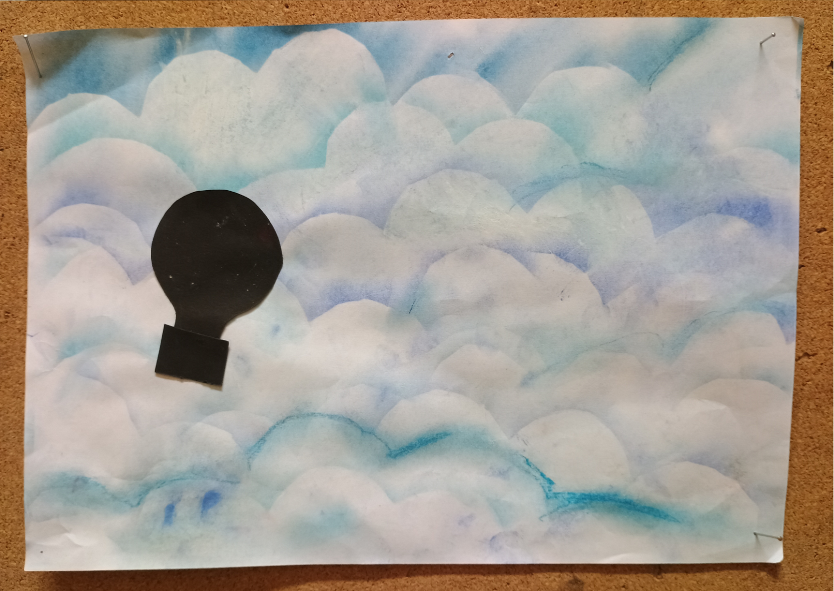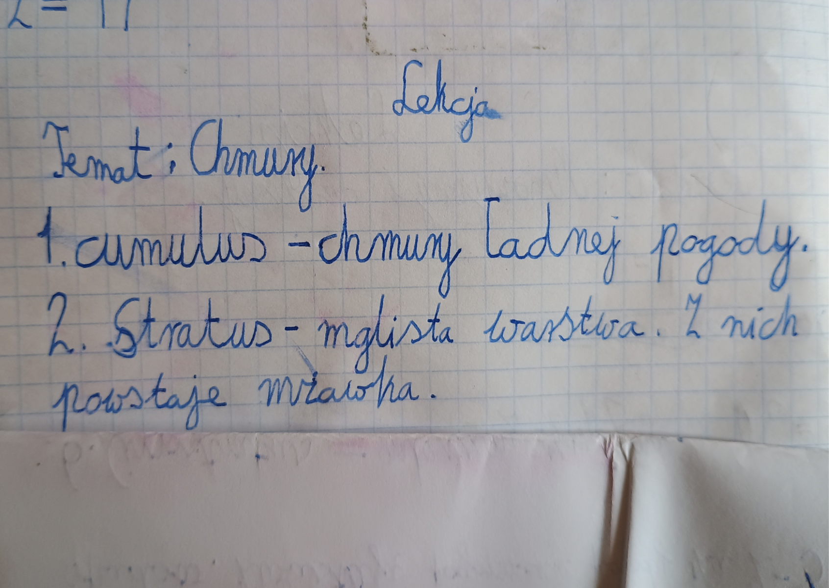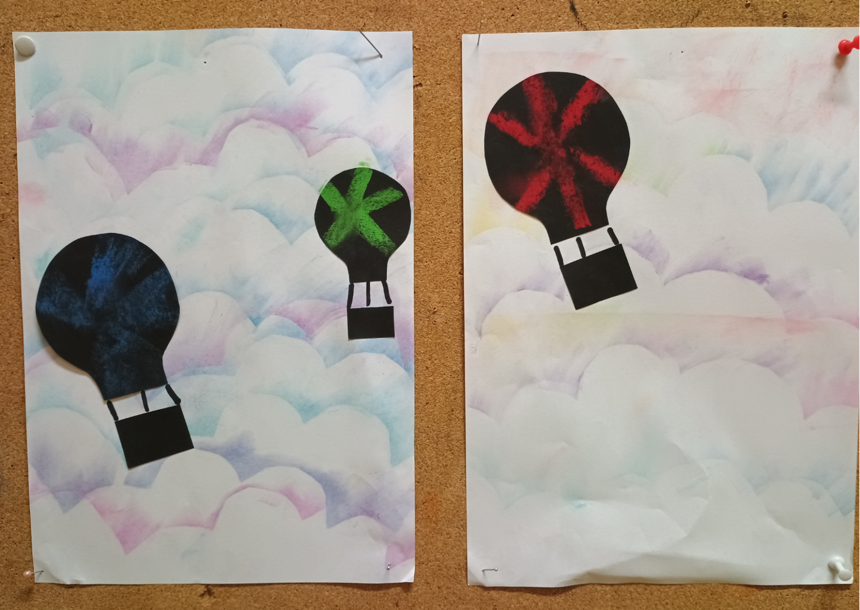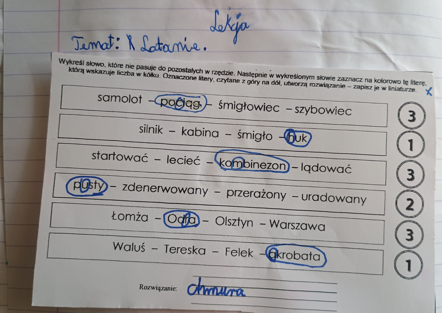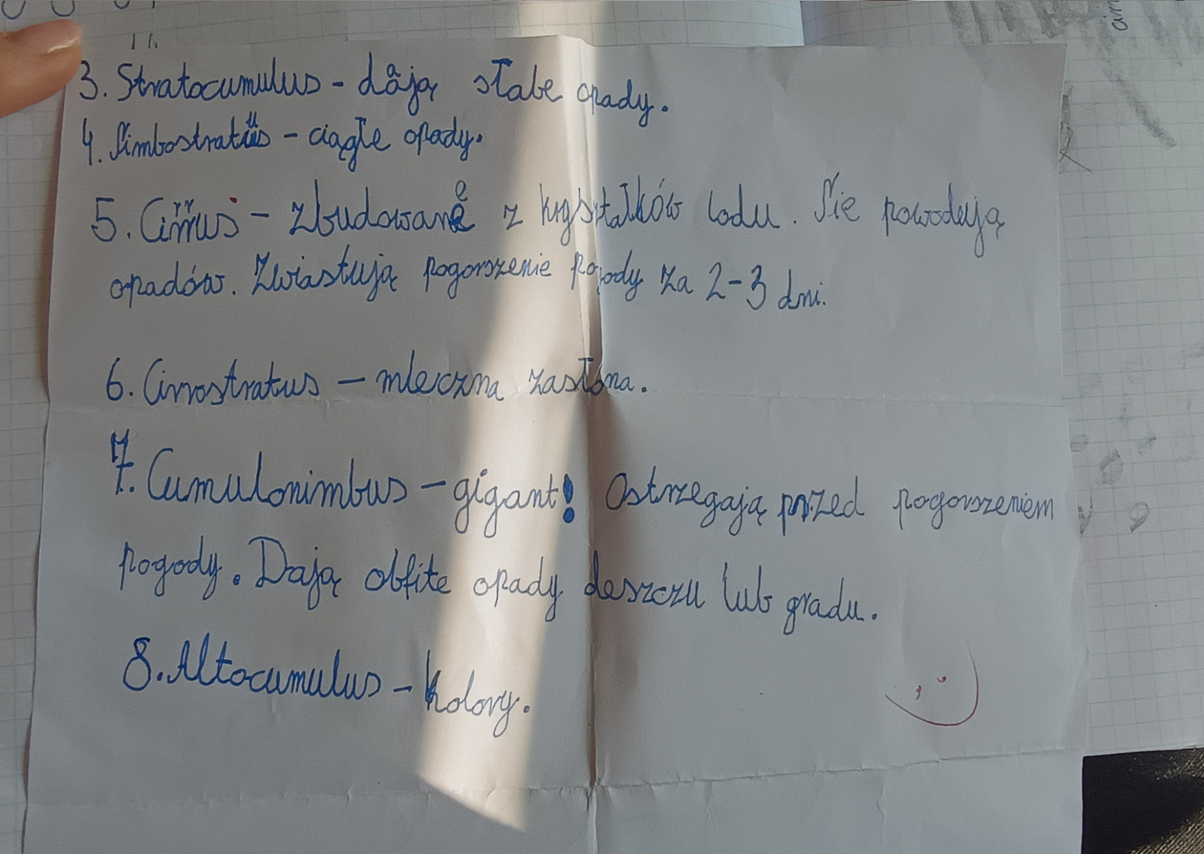 Samoloty przekierowały nas na temat odpowiednich warunków atmosferycznych. Rozwinęliśmy temat chmur. Świetnie wpisało się w to zadanie z wyszukiwaniem wyrazów, które nie pasowały do pozostałych. W efekcie hasło brzmiało właśnie „chmury” i od tego zaczął się temat pogłębiony zdjęciami, filmami, obserwacjami nieba, rozbudowaną notatką i szybką pracą plastyczną.