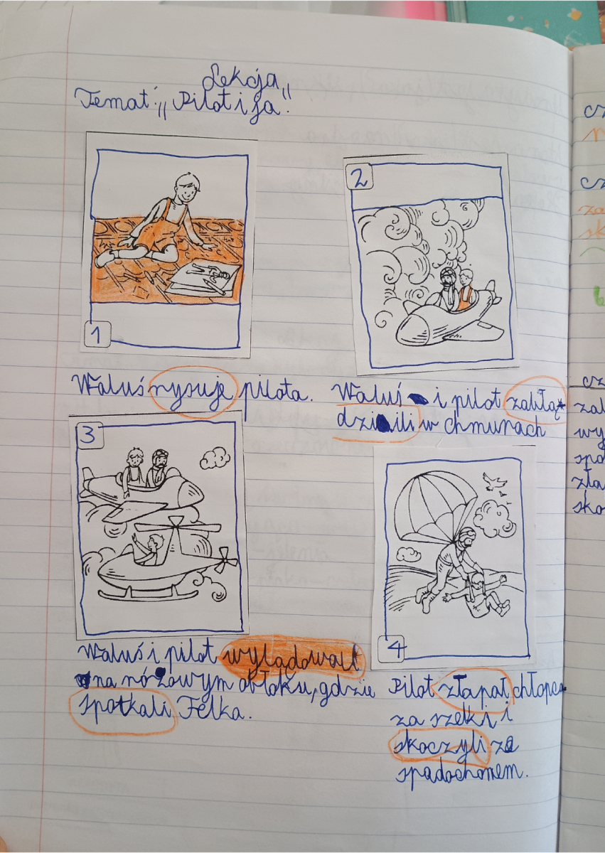 Zaproponowałam również dzieciom napisanie własnego opowiadania o wymyślonym pilocie. Napisałam na tablicy kilka sformułowań, które mogłyby pomóc w rozwinięciu tekstu. Wszystkie dzieci chętnie rozpoczęły zadanie, ale ich zaangażowanie szybko się zróżnicowało. Cały czas krążyłam między nimi, sprawdzając postępy i podpowiadając kolejne kroki. Niektóre dzieci szybko podprowadziłam do zakończenia opowiadania, inne z kolei zachęcałam do dłuższych rozwinięć.