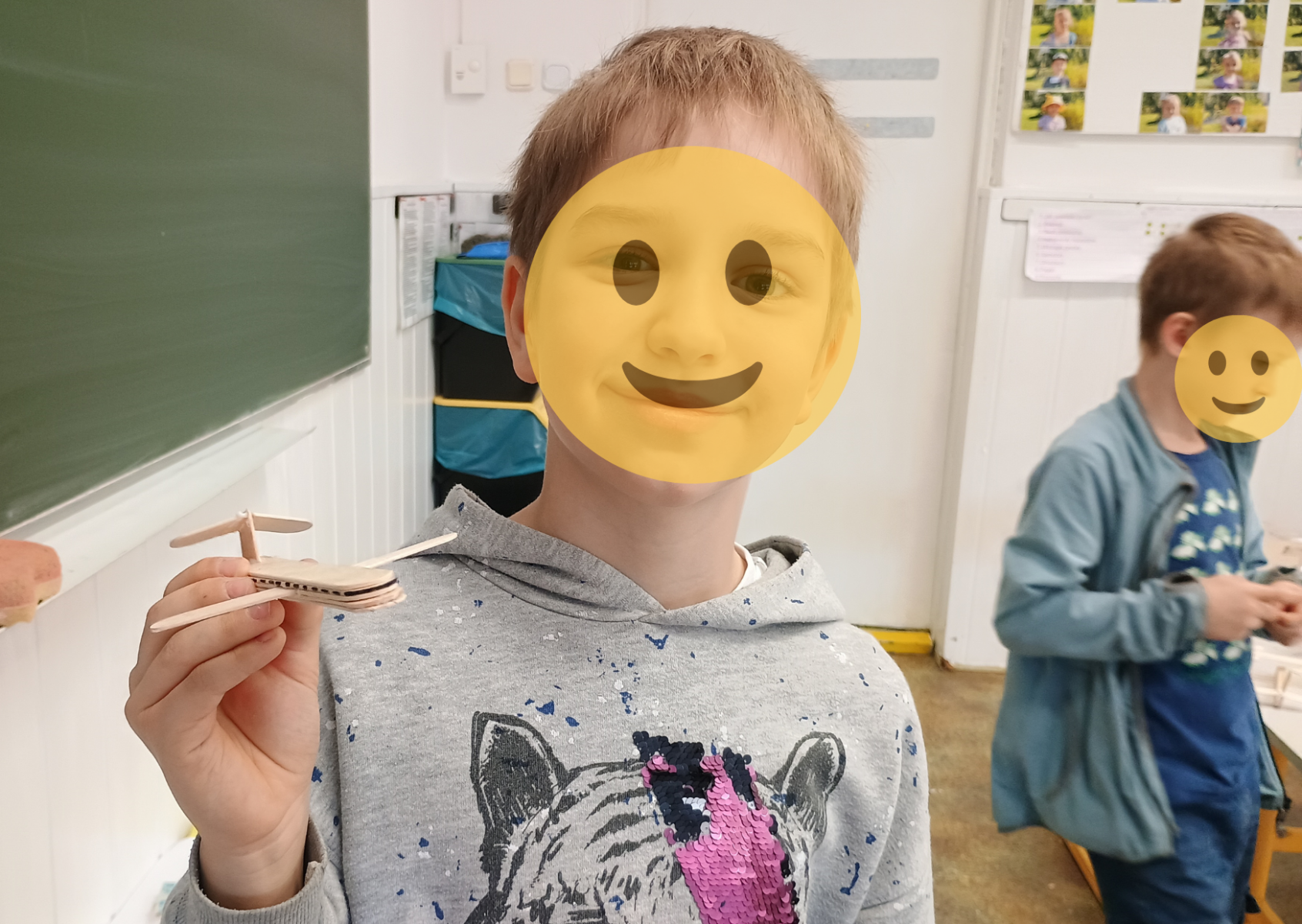 Propozycje samolotów z drewnianych patyczków były rozłożone na ławkach w różnych miejscach sali, a dzieci same wybierały, który model chcą zrobić. Mogły także zdecydować, ile modeli zrobią, mieszcząc się w czasie przeznaczonym na tę pracę. Niektórzy skupiali się na detalach, inni chcieli mieć więcej zrobionych samolotów. Nowością było także samodzielne korzystanie z gorącego kleju.