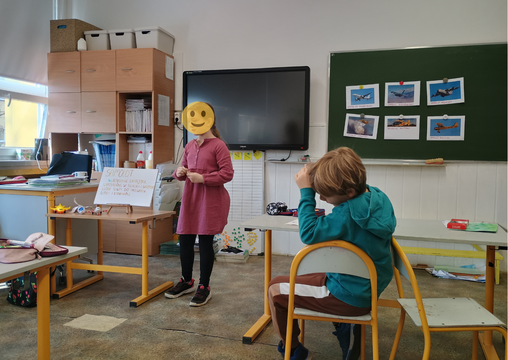 Julia przygotowała bardzo rozbudowany projekt. Z pomocą mamy zrobiła plansze o lataniu, a następnie zaprezentowała je na forum. Pokazała przyniesione modele samolotów oraz wydrukowane zdjęcia, które następnie opisała. Podzieliła klasę na trzy grupy, które wzięły udział w quizie podsumowującym. Praca Julii była wieloetapowa, przygotowania trwały około dwóch tygodni i dziewczynka bardzo się zaangażowała w prezentację.