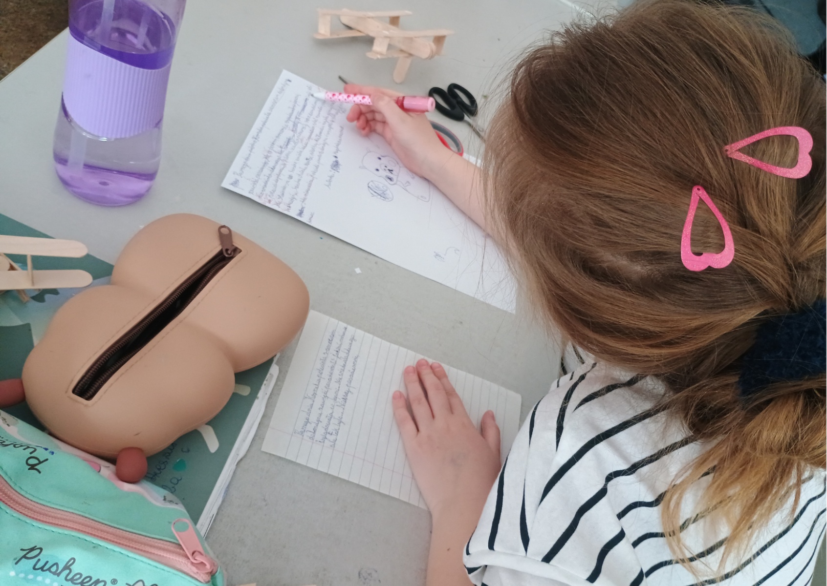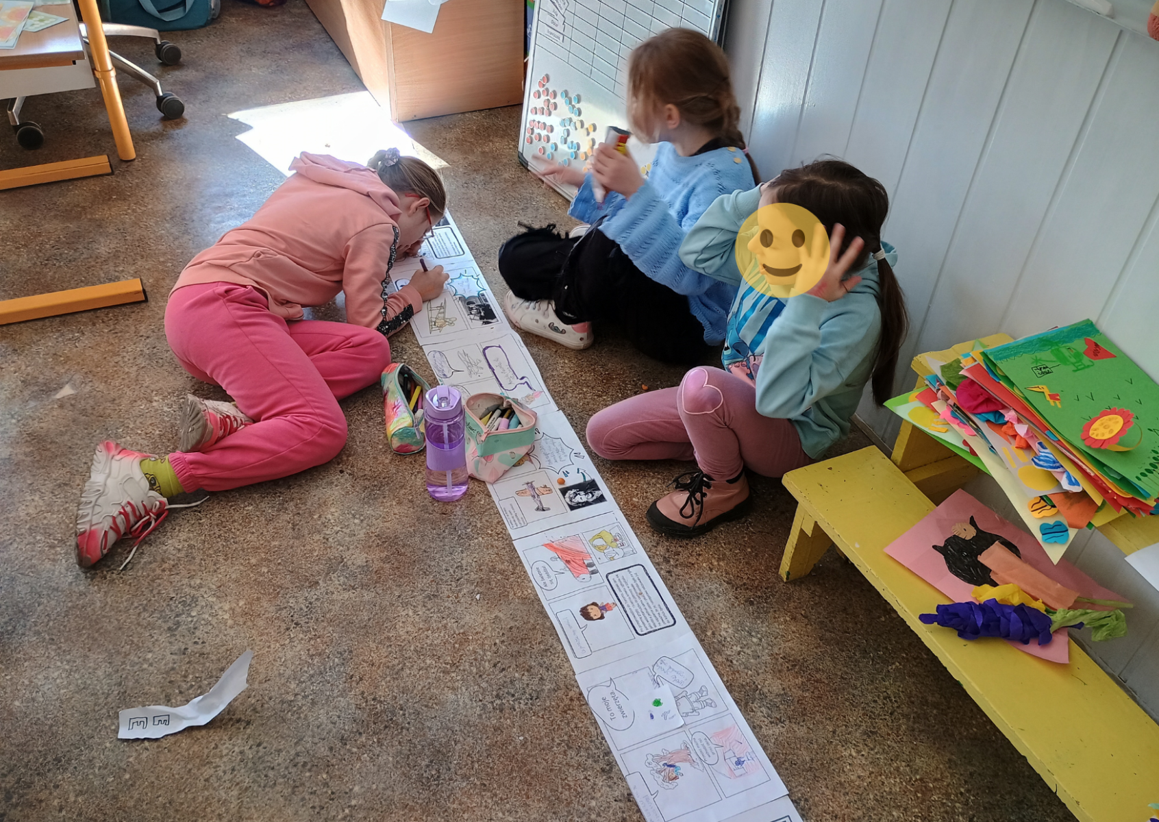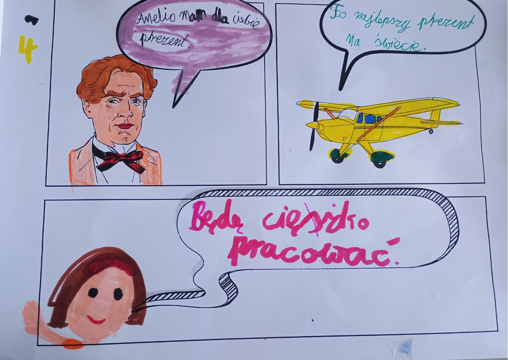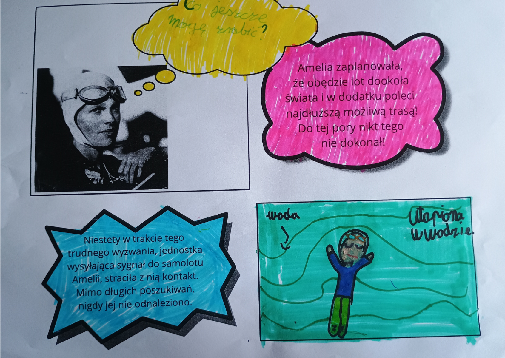 Rozbudowanym zadaniem była praca w grupie nad stworzeniem komiksu o sławnej pilotce Amelii Earhart. Dzieci wysłuchały fragmentu podcastu o dzieciństwie Amelii, a następnie o rozwoju jej pasji i kariery. Każda grupa dostała zestaw do stworzenia komiksu o Amelii. Niektóre chmurki były już uzupełnione, a niektóre trzeba było uzupełnić. Teksty do uzupełnienia znajdowały się w zestawie materiałów do pracy, ale dzieci musiały je przeczytać i dopasować do odpowiednich fragmentów historii (to znowu pokazuje potrzebę doskonalenia umiejętności czytania!).